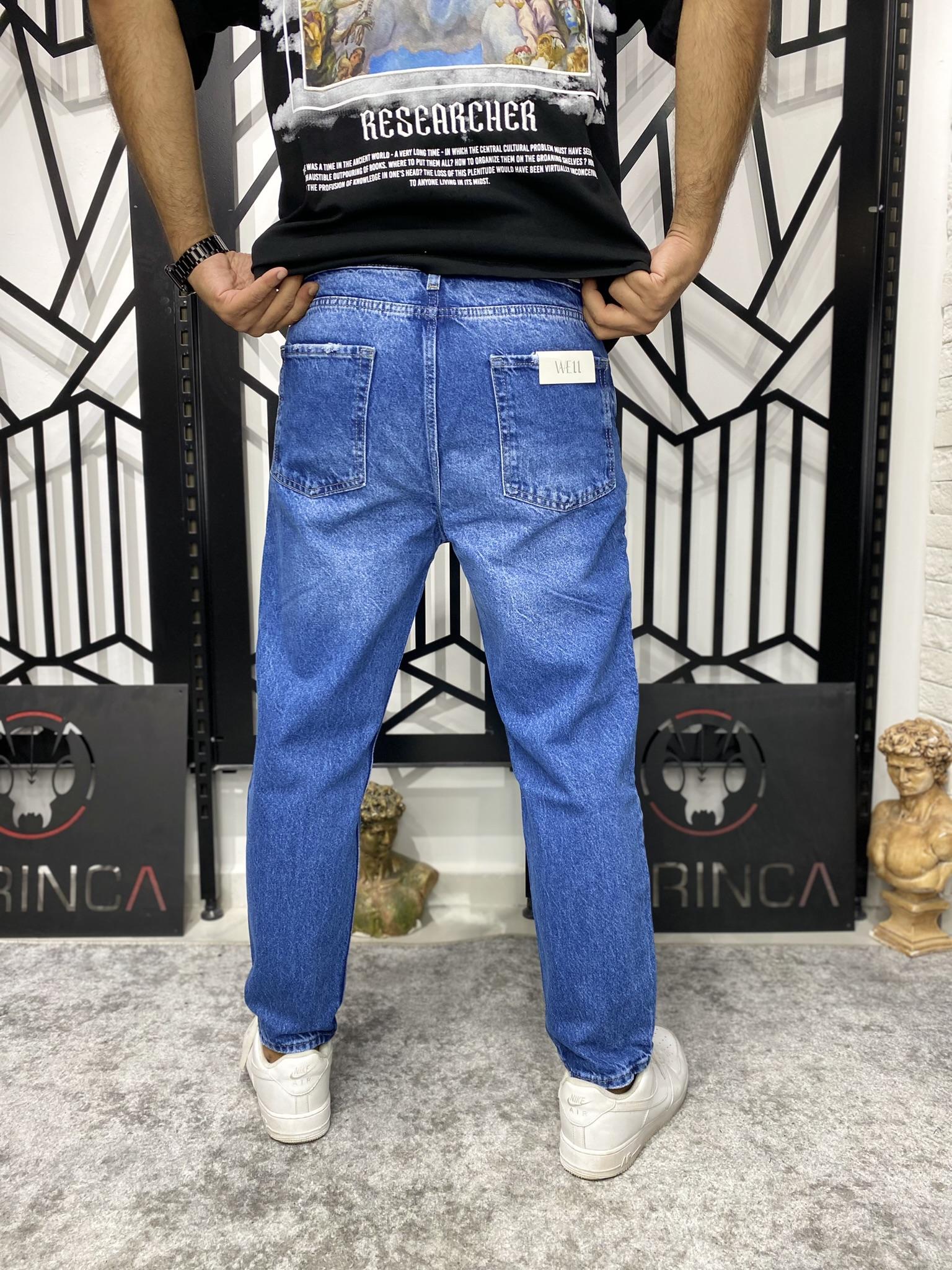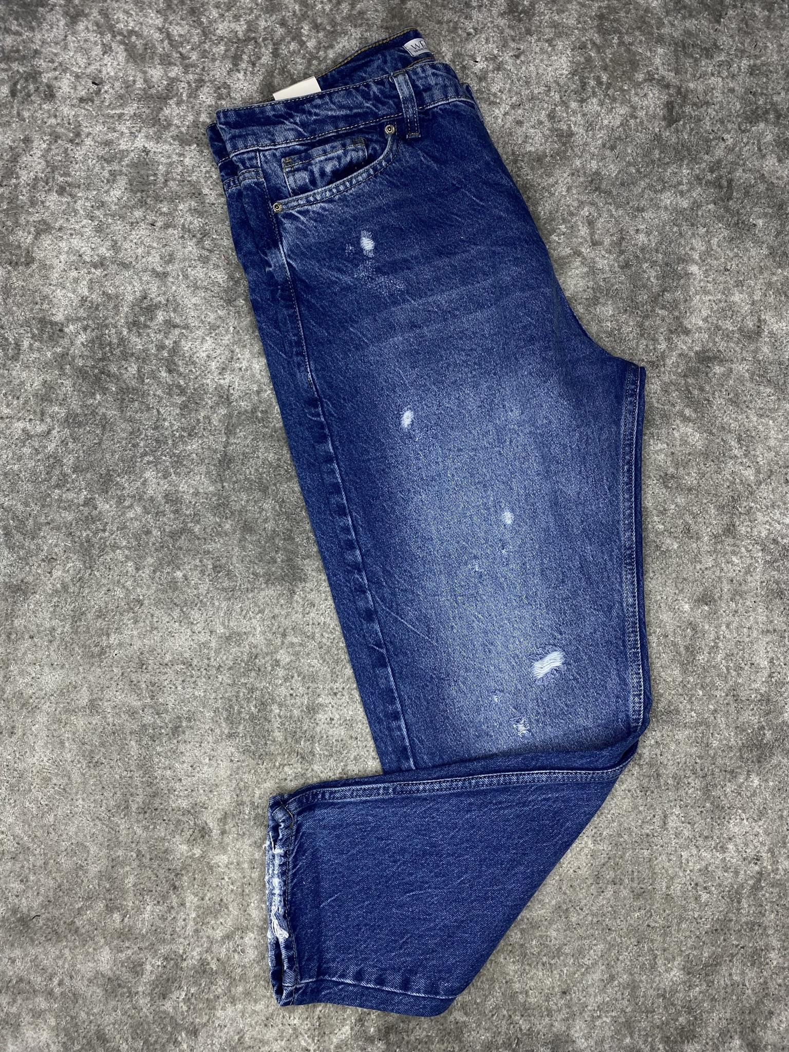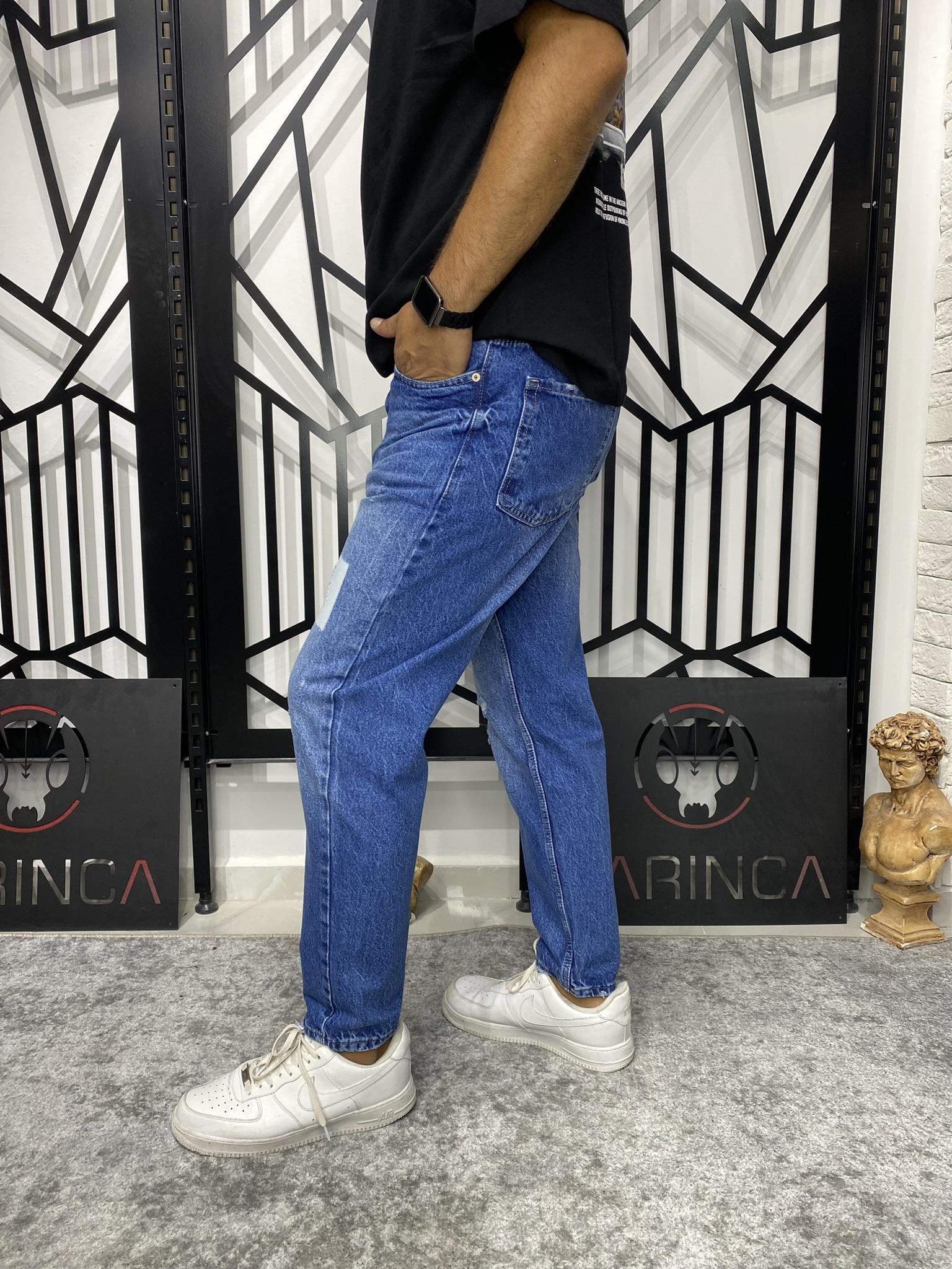 Koyu Mavi Bol Yırtık ve Desen Detaylı Boyfriend Kalıp Karot Kesim Havuç Model Kot Pantolon