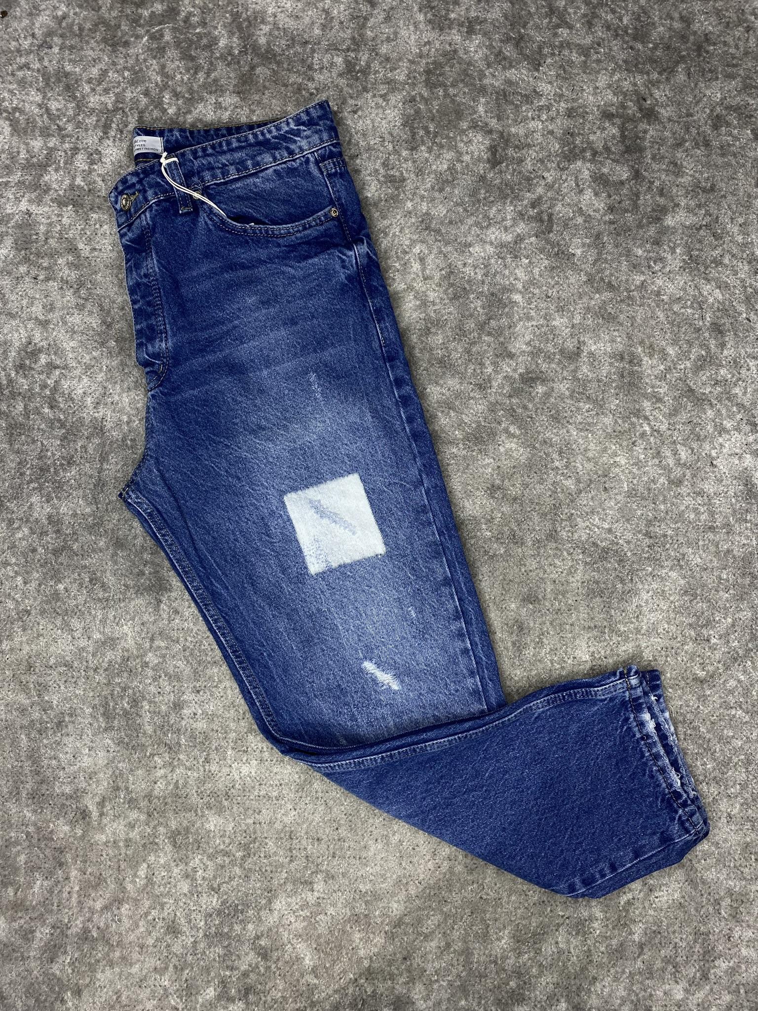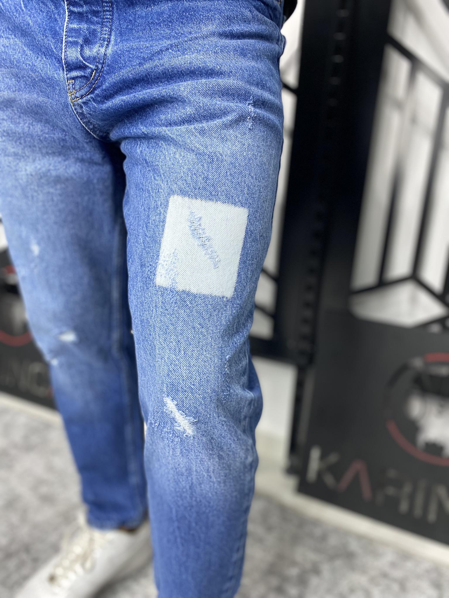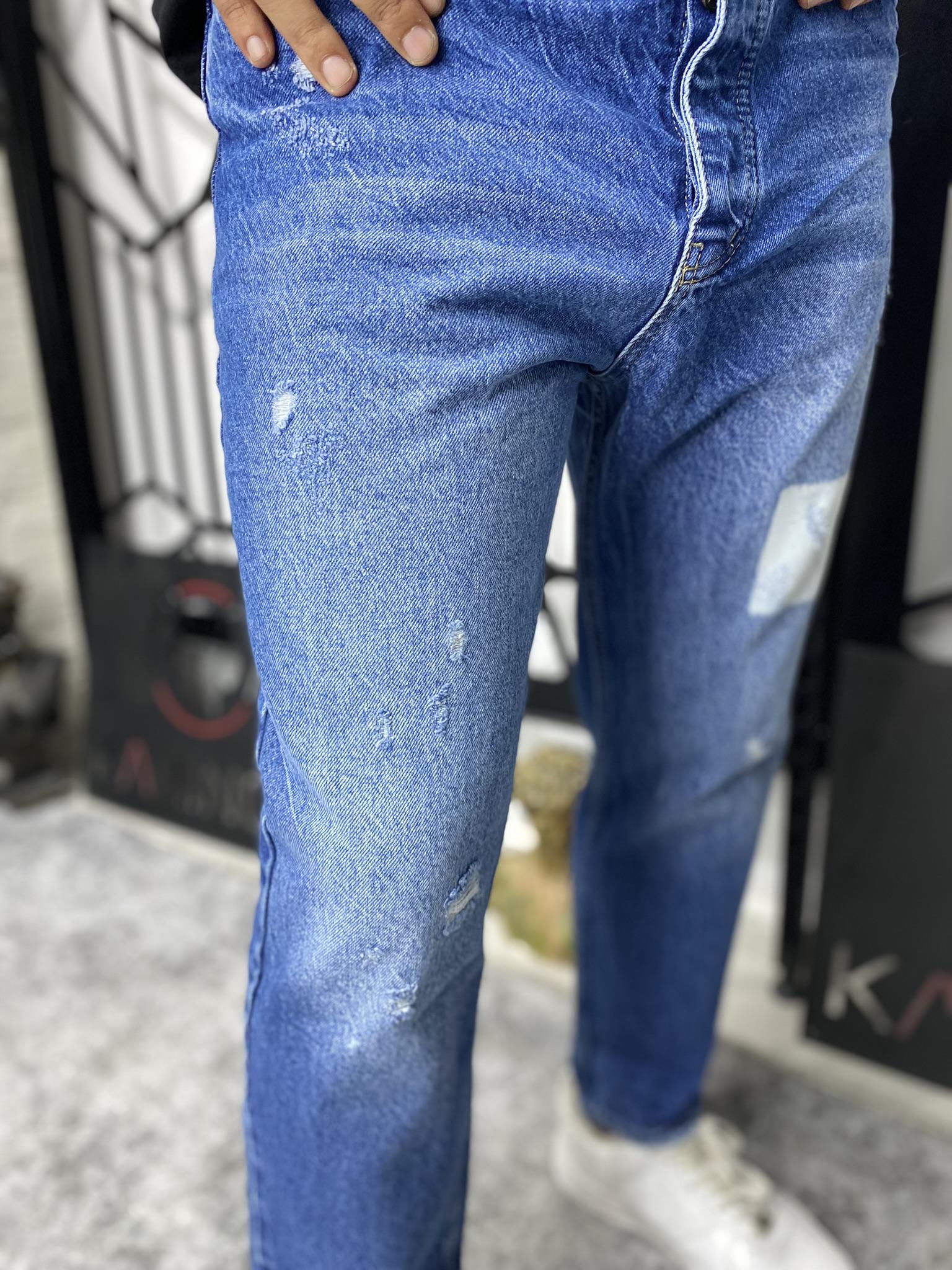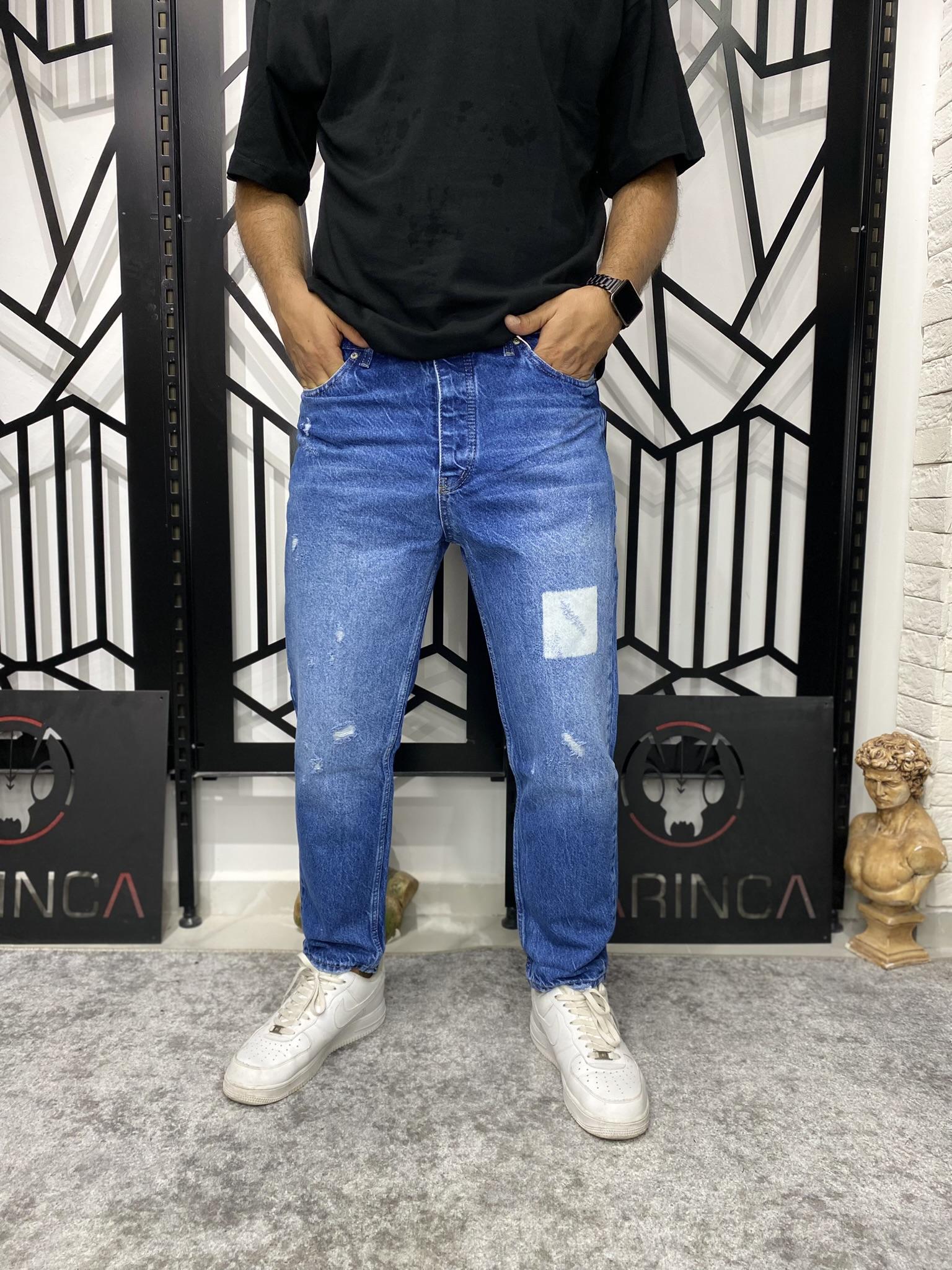 Koyu Mavi Bol Yırtık ve Desen Detaylı Boyfriend Kalıp Karot Kesim Havuç Model Kot Pantolon